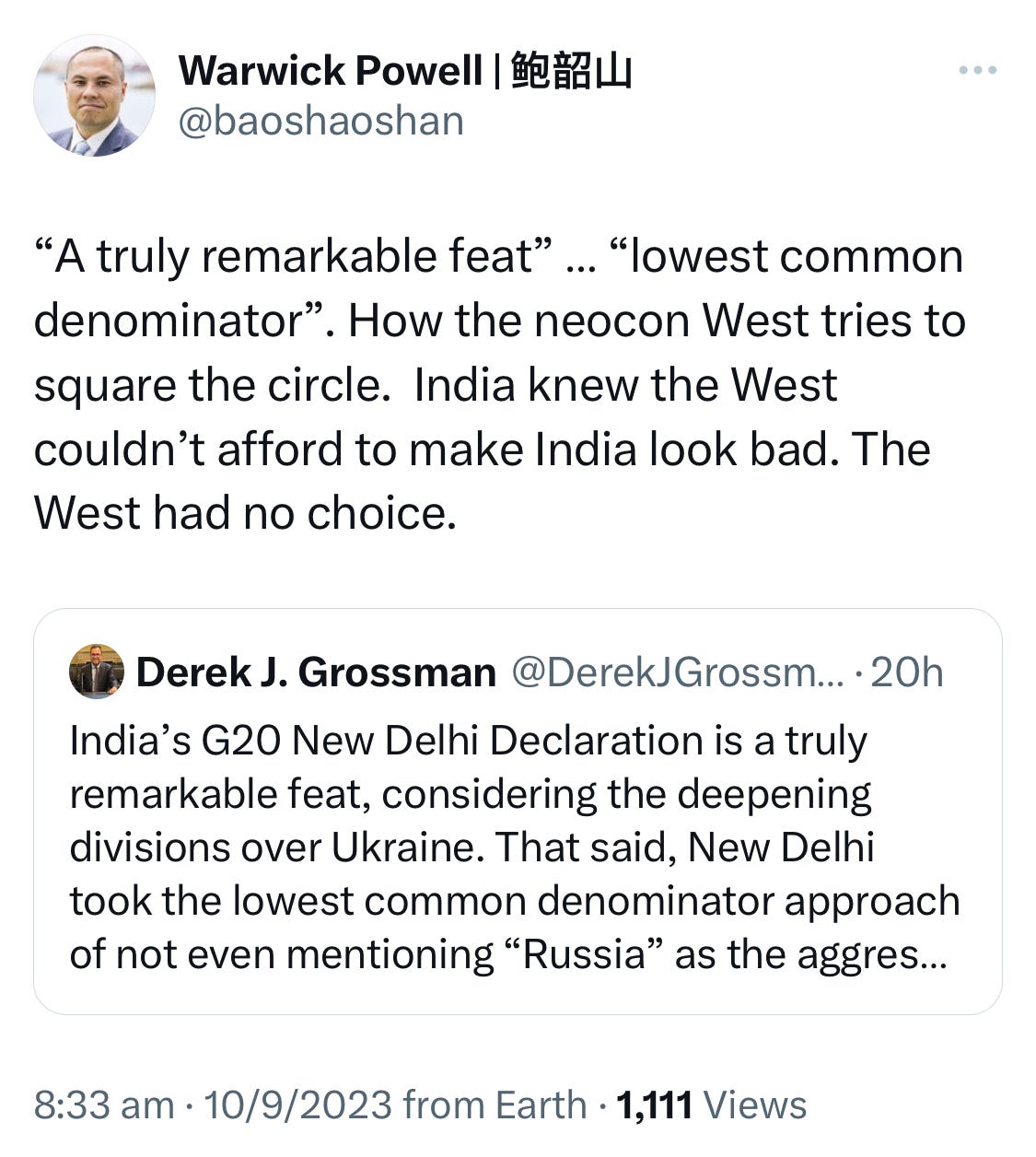 Ukraine was angry at what it saw as a watered down declaration. American neocons were similarly aghast. Indeed, some - like former White House National Security Advisor John Bolton, a hawk, in the West concluded in a Washington Post opinion piece that the G20 might as well “abolish itself”, and others like Derek Grossman from the neocon RAND Corporation at once complemented the New Delhi declaration as a “truly remarkable feat” while deriding India for taking “the lowest common denominator approach of not even mentioning ‘Russia’” (Exhibit 1). In any case, Ukraine currently has nowhere else to go; wasn’t invited despite trying to get a seat at the table (India said no, and the West could do nothing about it); and is staring down the reality of desolation at the end of the Primrose Path.