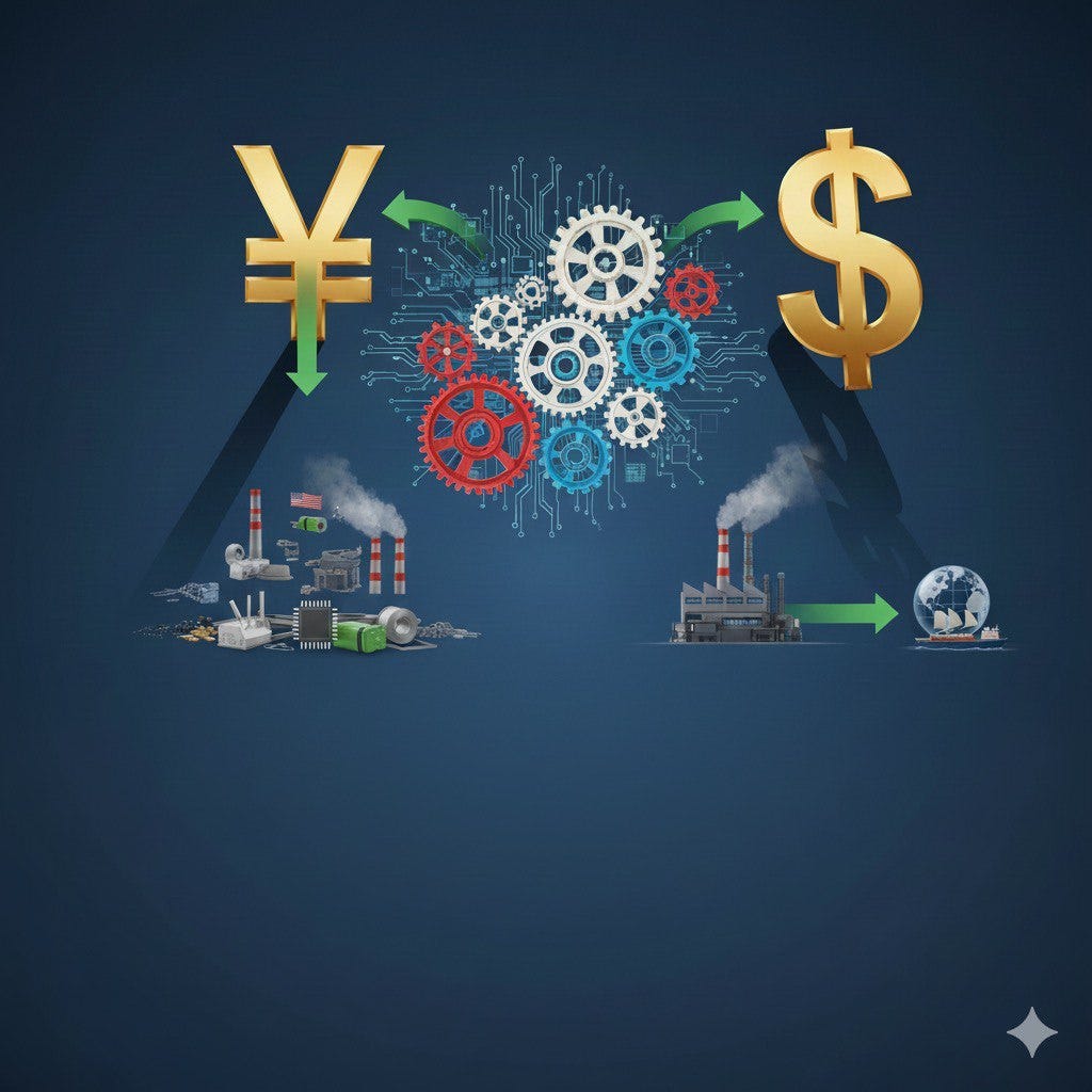 The U.S. economy’s structure exacerbates this vulnerability. Unlike China’s export-oriented model with high FVA, U.S. exports have domestic content of 85-90%, but imports - particularly intermediates and capital goods - are critical for manufacturing. In 2025, U.S. imports from China total around $500 billion annually, dominated by electronics, machinery, and critical minerals where China holds market dominance.  A USD depreciation (or RMB appreciation) directly inflates these costs, with near-complete pass-through for commodities. Studies like Cavallo et al. (2021) show that in GVCs, Chinese exporters absorb shocks by passing on savings, keeping USD prices stable, while U.S. importers face unmitigated hikes.