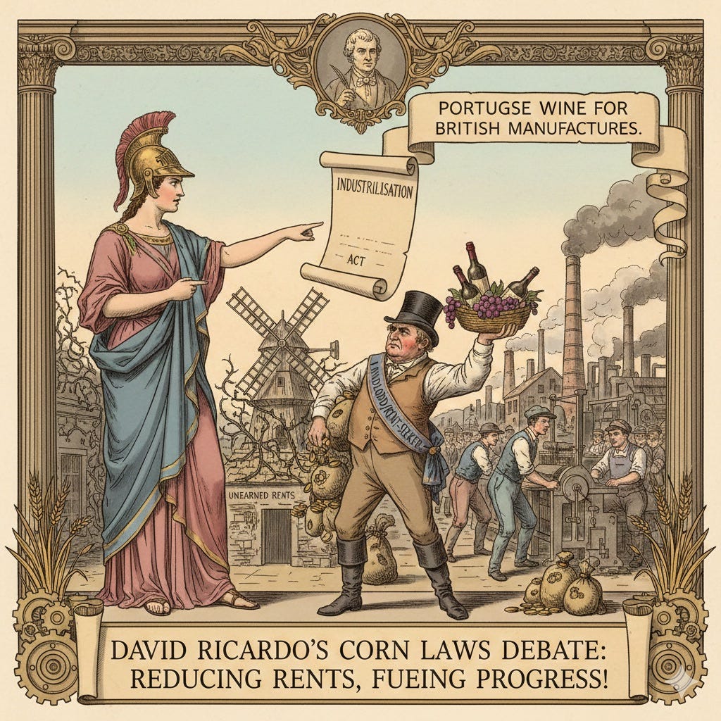The decontextualisation of Ricardo into a neoliberal slogan has served ideological purposes, but it has obscured a far richer thinker. Tribe, Lanot, Walter and the broader Cambridge-style history of economic thought restore him as a counsellor embedded in Britain’s transition to industrial supremacy - hostile to rentier extraction, focused on production and surplus circulation, realistic about fixed capital’s rigidities, and pragmatic about trade policy. His intervention on the Corn Laws was tactical counsel in a class-distributional struggle, not, I would suggest, the birth of timeless doctrine.